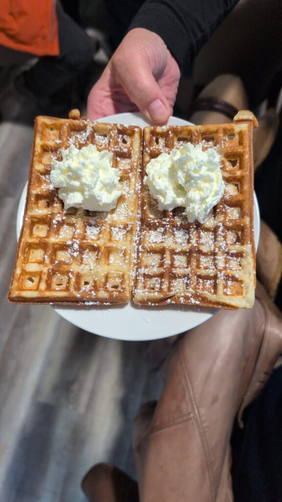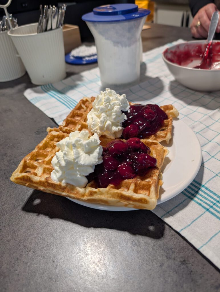 Serviert wurden frisch gebackene belgische Waffeln, wahlweise mit Puderzucker, heißen Kirschen oder Sahne. Die Auswahl kam bestens an, und nicht wenige gönnten sich sogar eine zweite Portion.