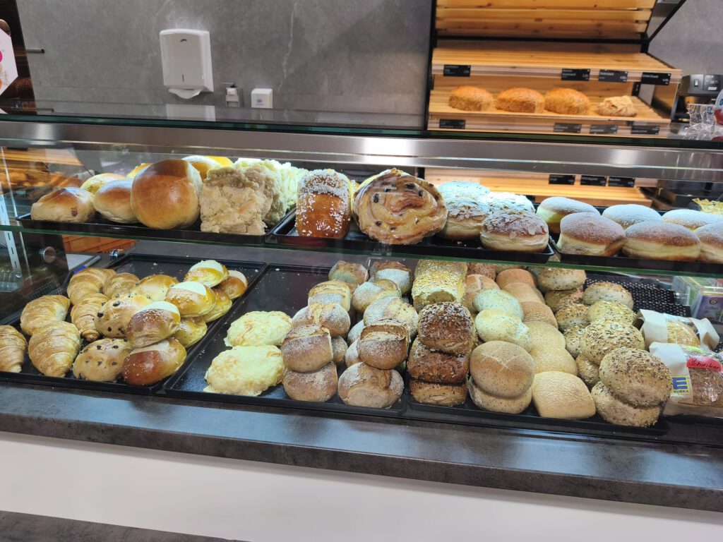 An sieben Tagen in der Woche werden bis zu zehn verschiedene Brötchensorten geliefert. Ergänzt wird das Sortiment durch wechselnde Brotsorten, Fläden, Sahneschnitten sowie eine Auswahl an Obstkuchen. Auch bei den Broten setzen wir bewusst auf Abwechslung: Beliebte Sorten wie das Familienbrot oder das 5-Saat-Brot werden regelmäßig angeboten und meist im Laufe des Vormittags in einer zweiten Lieferung frisch von der Bäckerei Moss angeliefert.